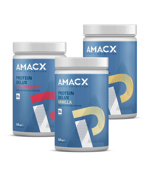 Protein Delux d’Amacx est un mélange de protéines qui favorise la récupération musculaire. En cas de charge d'entraînement élevée, votre corps a besoin de plus de protéines pour récupérer et construire du muscle. Ce mélange de protéines convient comme complément à votre alimentation quotidienne. Cette poudre contient un pourcentage élevé de protéines de lactosérum. Disponible dans les saveurs Banane, Fraise et Vanille.