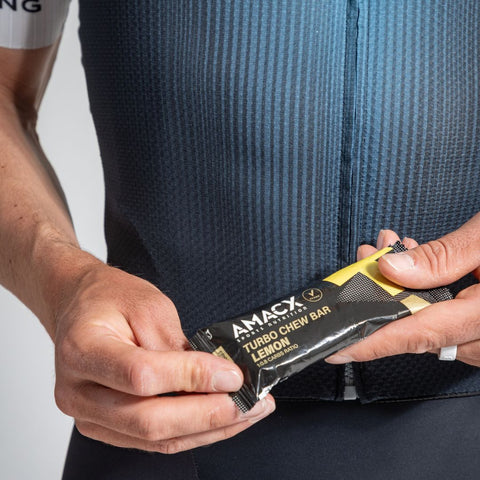 La barre énergétique Amacx Turbo Chew Bar, développée en collaboration avec l'équipe Jumbo-Visma, est la barre énergétique parfaite pour cela. Avec un rapport optimal de 1:0,8 entre le glucose et le fructose et 40 grammes de glucides, cette barre est idéale pour reconstituer vos réserves de glycogène pendant les efforts intenses. Et grâce à sa texture douce et transparente et à sa faible teneur en matières grasses, en protéines et en fibres, la Turbo Chew vous aide à